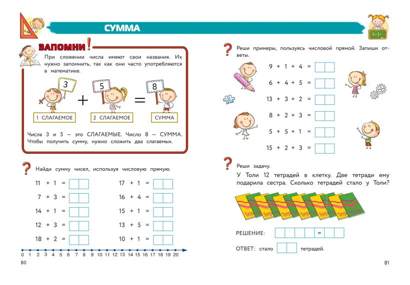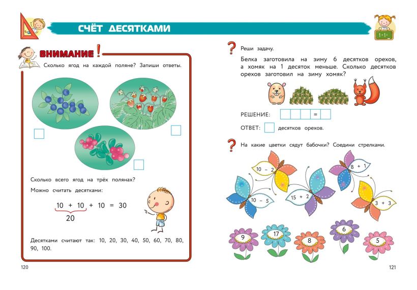 Выполняя интересные игровые задания, ребенок познакомится с числами первого и второго десятка, понятиями «больше», «меньше», «равно», порядковым счетом, научится сравнивать предметы по количеству, считать до 100, складывать и вычитать десятки, писать цифры, решать примеры с помощью числовой прямой. По книге можно заниматься несколько лет, если ребенку 5 лет, а можно пройти ее за год, если ему скоро в школу. Во время занятий малыш не будет отвлекаться, так как все задания даются в игровой форме, а яркие цветные картинки сразу привлекут внимание любознательного непоседы.