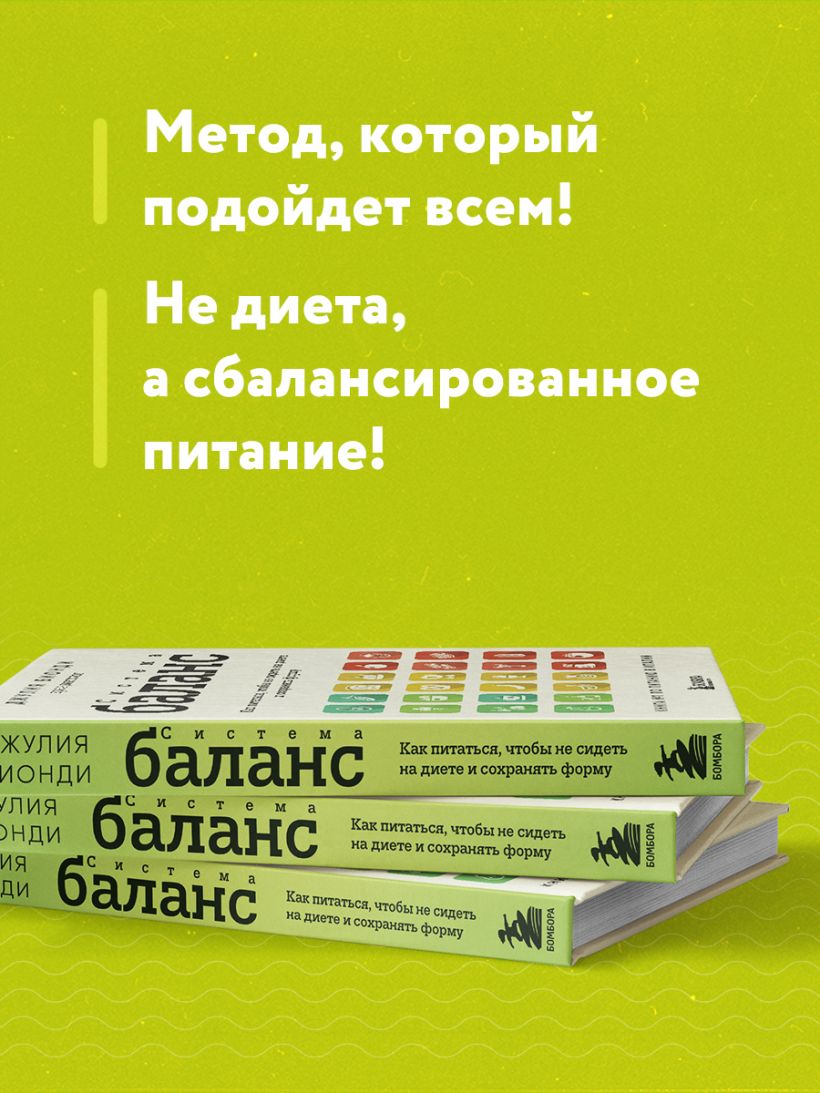 Специалист по питанию Джулия Бионди разработала авторский метод «Баланс», который научит питаться правильно и осознанно, подстраивая приемы пищи под свой уникальный стиль жизни. Беседуя с читателем как с близким другом, автор на простых примерах расскажет, как распределяются калории в течение дня, усваивается пища и накапливается вес. Поняв этот процесс, вы сможете грамотно выстроить питание под себя, сохранив его богатство и разнообразие.