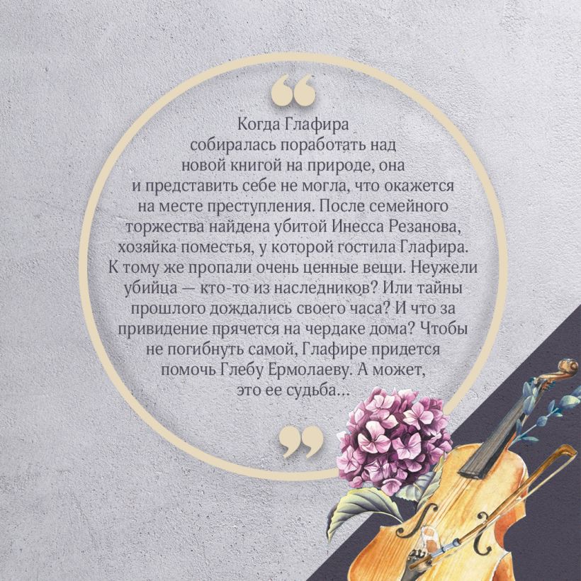 Когда Глафира собиралась поработать над новой книгой на природе, она и представить себе не могла, что окажется на месте преступления. После семейного торжества найдена убитой Инесса Резанова, хозяйка поместья, у которой гостила Глафира. К тому же пропали очень ценные вещи. Неужели убийца — кто-то из наследников? Или тайны прошлого дождались своего часа? И что за привидение прячется на чердаке дома? Чтобы не погибнуть самой, Глафире придется помочь Глебу Ермолаеву. А может, это ее судьба…