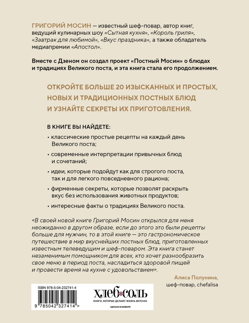 Если вы думаете, что постная еда — это невкусно, вы глубоко ошибаетесь. В этой книге вы найдете рецепты, которые изменят ваше представление о рационе во время Великого поста. Григорий Мосин подготовил разнообразные блюда, сочетая классику, проверенную временем, и современные интерпретации. Вы найдете не только оригинальные рецепты, но и идеи, подходящие как для строгого поста, так и для легкого повседневного рациона, фирменные приемы шеф-повара, раскрывающие вкус без использования животных продуктов, а также советы для создания полноценного и разнообразного меню.