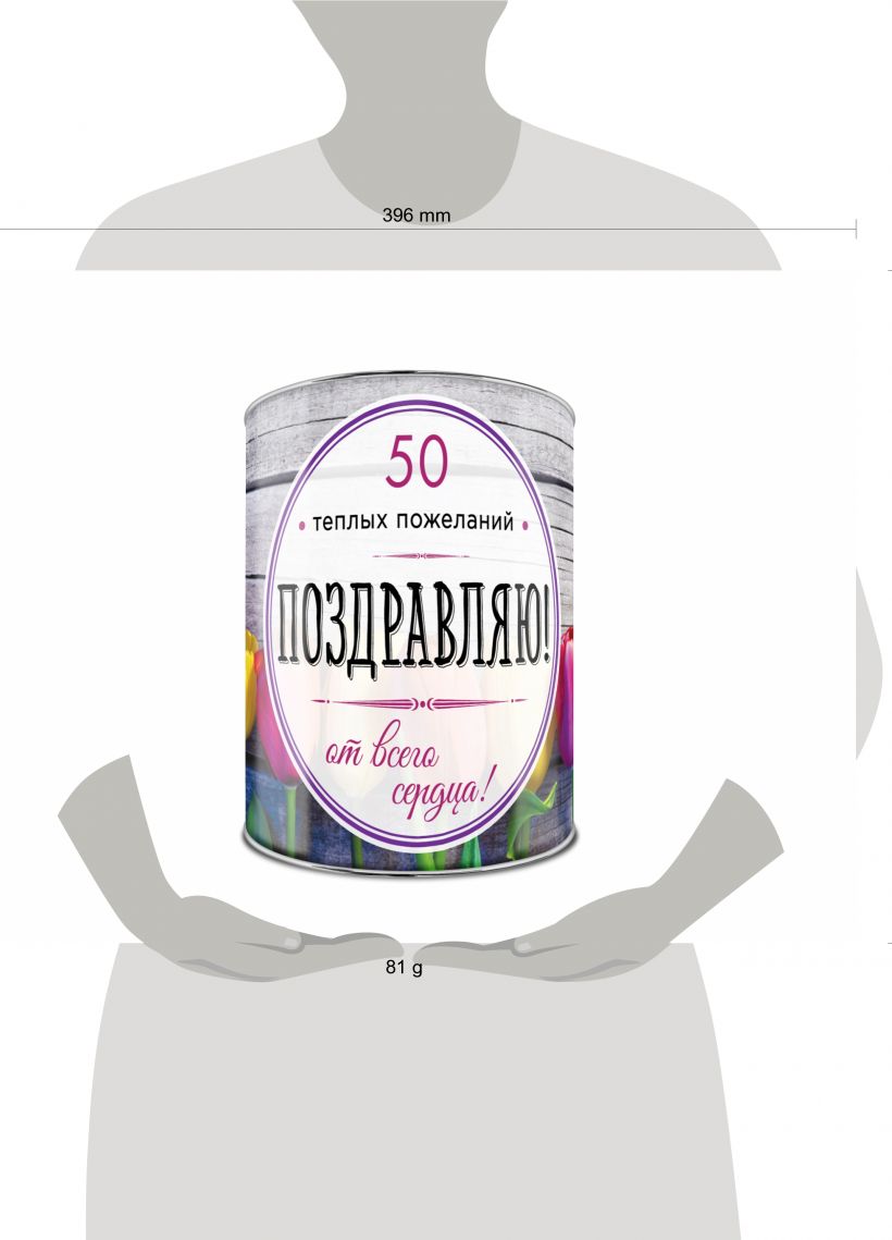 "Эта банка – самый оригинальный и трогательный способ поздравить близкого вам человека! Под крышкой – 50 теплых комплиментов и пожеланий, которые непременно вызовут прекрасное настроение и улыбку на лице виновника торжества. Такой подарок запомнится надолго! Все, что нужно сделать вам – подарить эту банку, а имениннику – вытягивать по одной бумажке, читать и получать заряд позитивных эмоций!