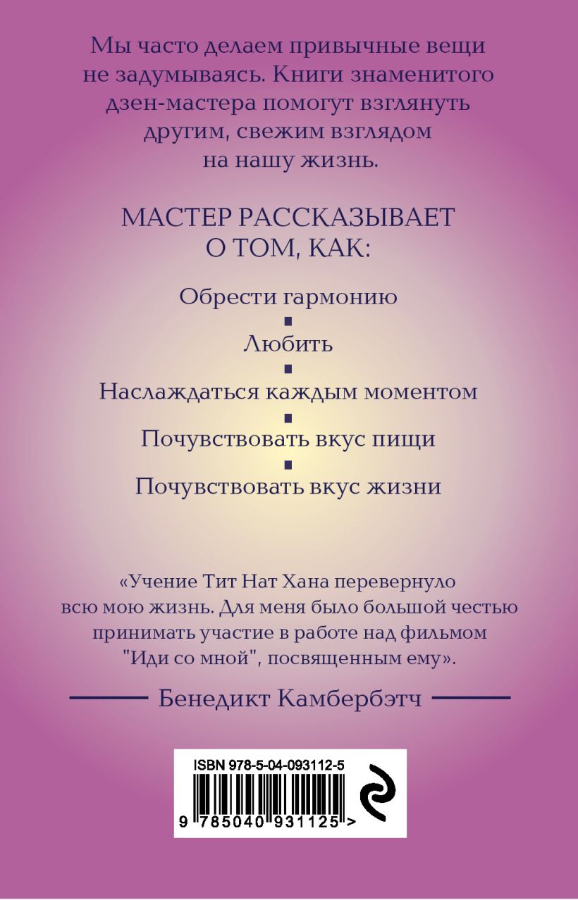 Книги знаменитого мастера дзен медитации помогут взглянуть другим, свежим взглядом на нашу жизнь, начать ценить каждое ее мгновение. Тит Нат Хан рассказывает о том, как обрести гармонию внутри себя и прийти к согласию с окружающим миром, как наладить отношения с любимыми людьми, взрастить подлинные чувства, как осознанно питаться, почувствовать вкус пищи и, наконец, вкус к самой жизни.