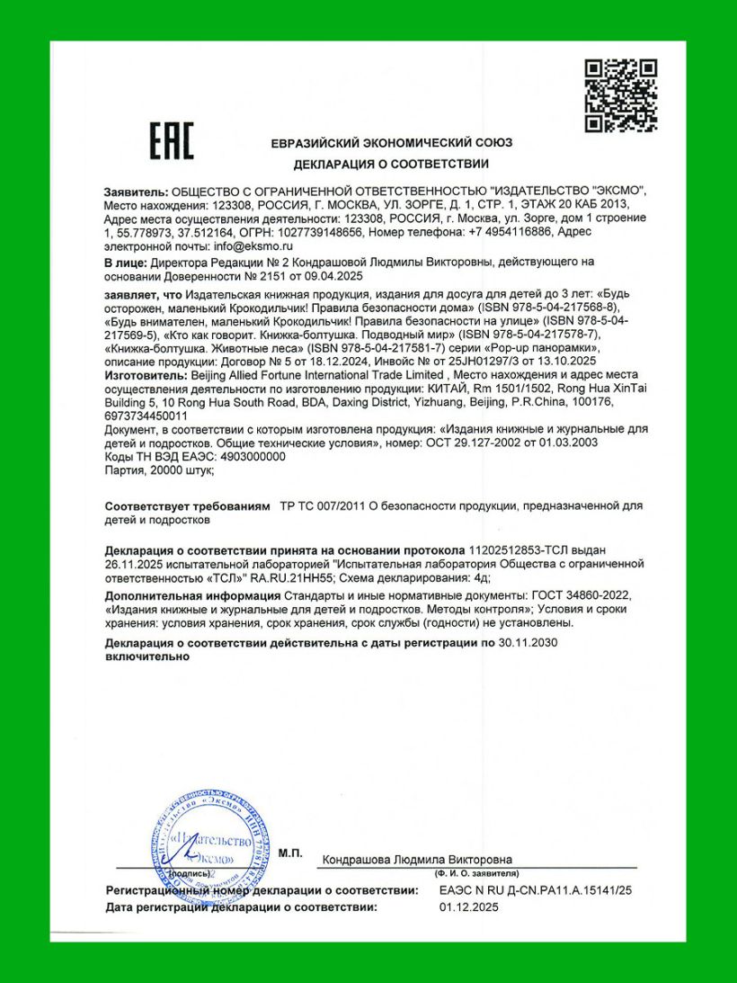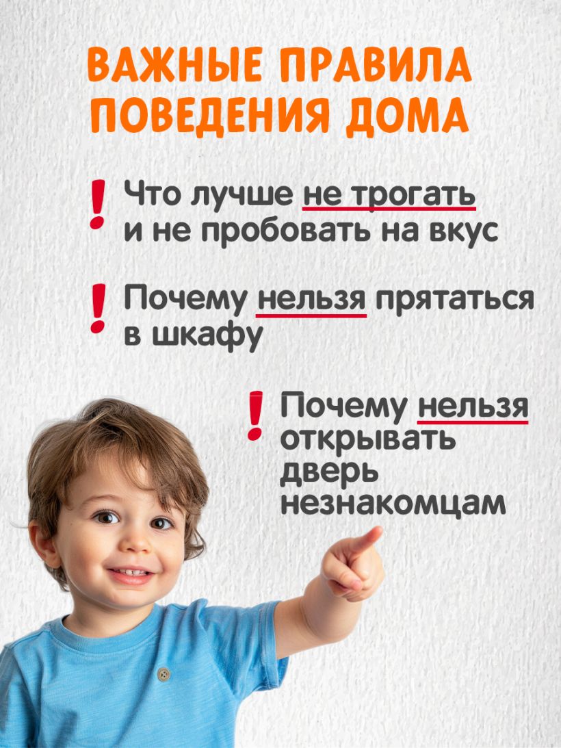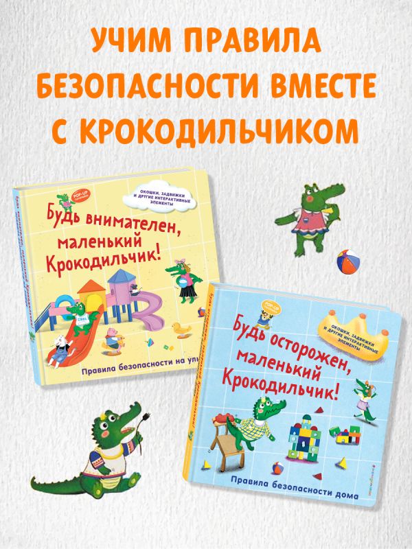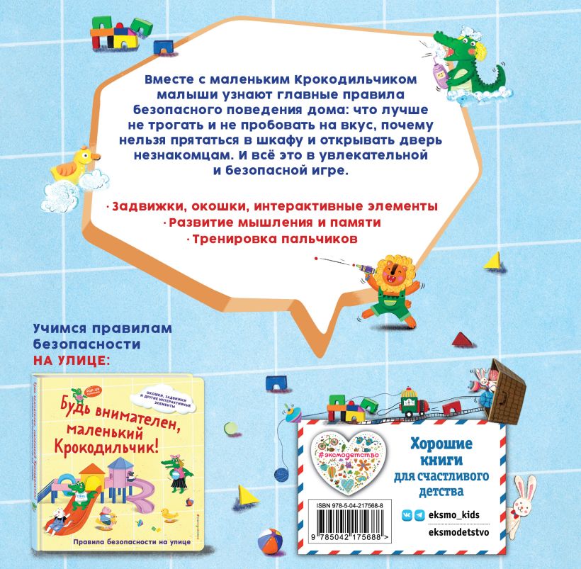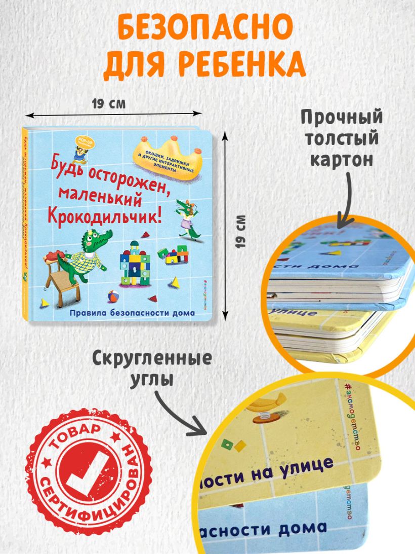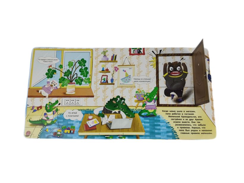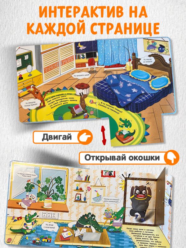 С интерактивной книжкой-игрушкой малыши узнают главные правила безопасного поведения дома: что лучше не трогать и не пробовать на вкус, почему нельзя прятаться в шкафу и открывать дверь незнакомцам. И всё это в увлекательной игре вместе с маленьким Крокодильчиком.