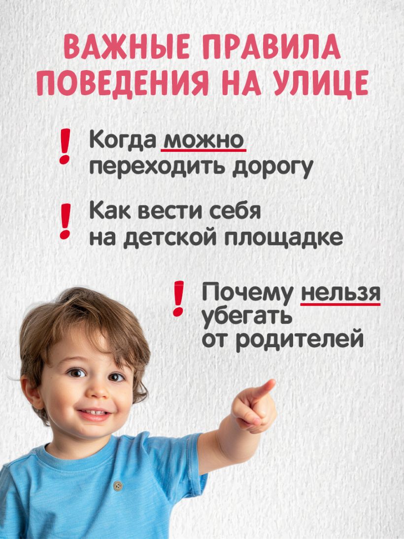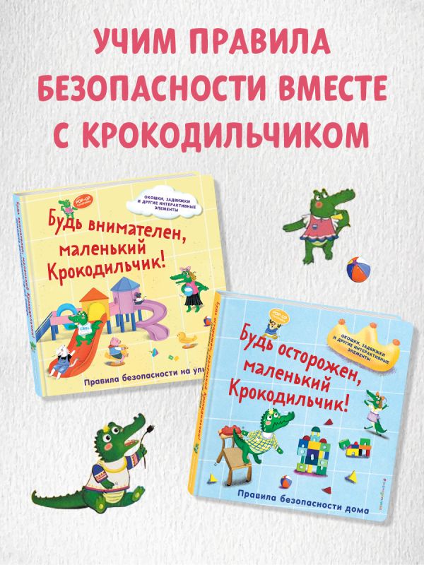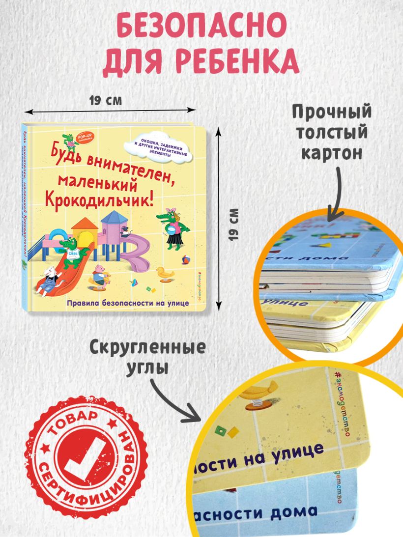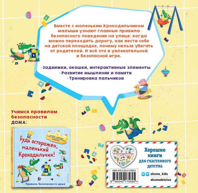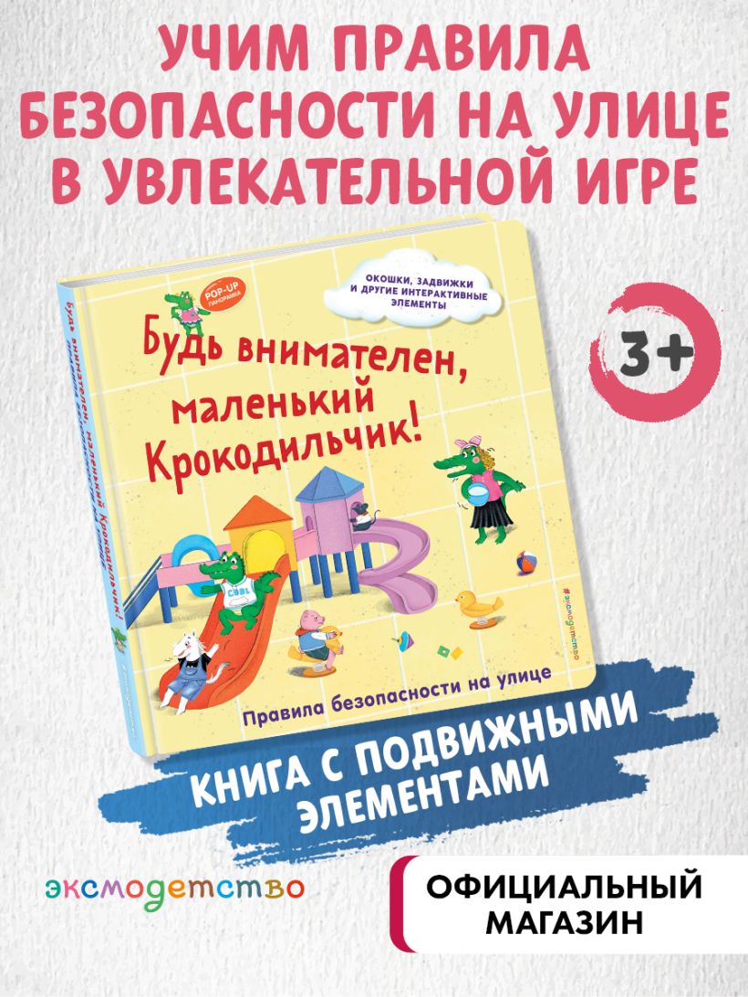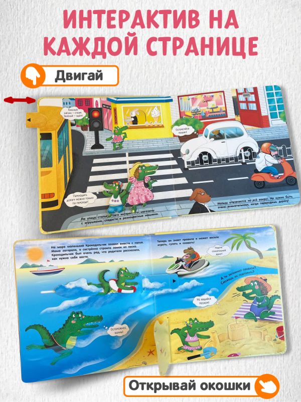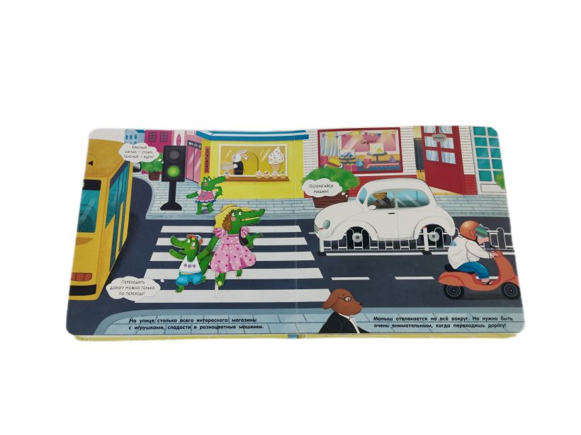 С интерактивной книжкой-игрушкой малыши узнают главные правила безопасного поведения на улице: когда можно переходить дорогу, как вести себя на детской площадке, почему нельзя убегать от родителей. И всё это в увлекательной игре вместе с маленьким Крокодильчиком.