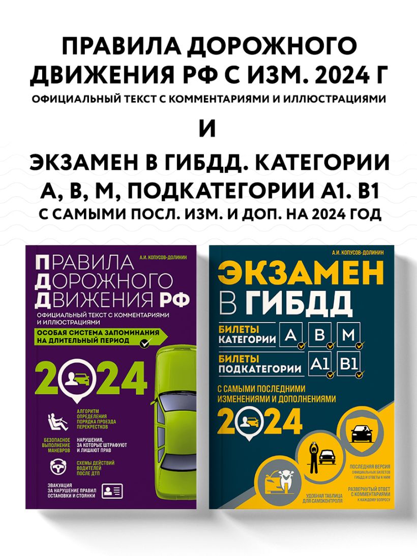 В комплект входят: Правила дорожного движения РФ с изм. 2024 г. Официальный текст с комментариями и иллюстрациями, Экзамен в ГИБДД. Категории А, В, M, подкатегории A1. B1 с самыми посл. изм. и доп. на 2024 год.