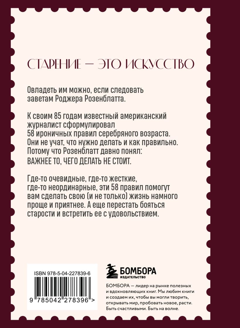 Овладеть им можно, если следовать заветам Роджера Розенблата. К своим 85 годам известный американский журналист сформулировал 58 ироничных правил серебряного возраста. Они не учат, что нужно делать и как правильно. Потому что Розенблат давно понял: важнее то, чего делать не стоит.