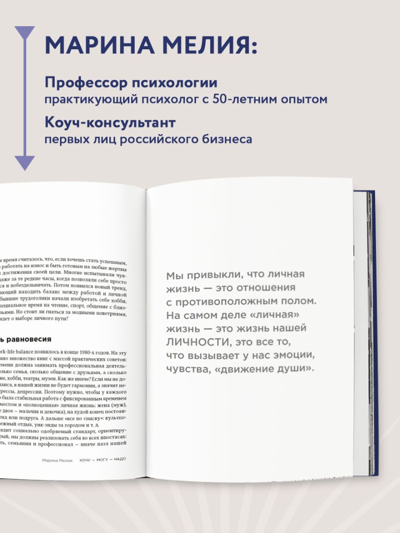 Эта книга объединяет в себе два бестселлера Марины Мелия, посвященные психологии успеха и эффективной коммуникации — «Хочу — Могу — Надо. Узнай себя и действуй» и «Всё не так. Как выбираться из тупиков общения, в которые мы сами себя загоняем».