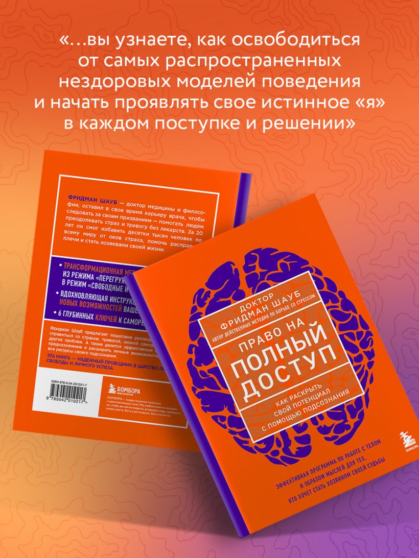 Многие из нас ищут ответы, которые помогли бы справиться с тревогой, низкой самооценкой, неуверенностью в себе, бессонницей и множеством других проблем. Доктор философии и медицины Фридман Шауб собрал в книге самые действенные инструменты, которые освободят от оков беспокойства и сомнений в себе, а затем расширят возможности и помогут достичь вершин, к которым вы стремитесь. Книга обязательна к прочтению для всех, кто хочет обладать правом полного доступа к своему подсознанию и пути к своему личному успеху.