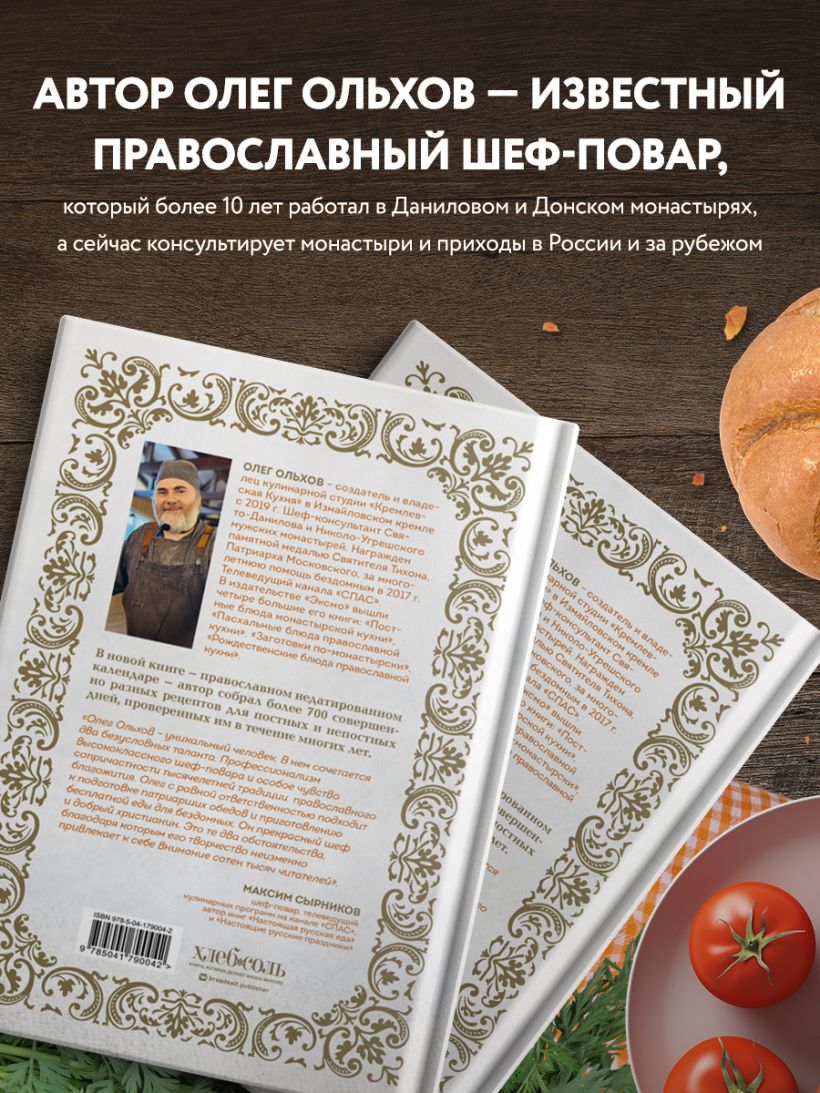 Олег Ольхов — известный в православном мире шеф-повар, не раз готовивший и проводивший трапезы во многих монастырях России, в том числе и многолюдные архиерейские. Много лет работал шеф-поваром в московском Даниловом монастыре. Неоднократно участвовал в качестве эксперта во всевозможных православных московских и региональных фестивалях. Организовал кулинарную школу и проводит мастер-классы в Измайловском кремле. В его арсенале — десятки тысяч блюд и богатый опыт их приготовления.