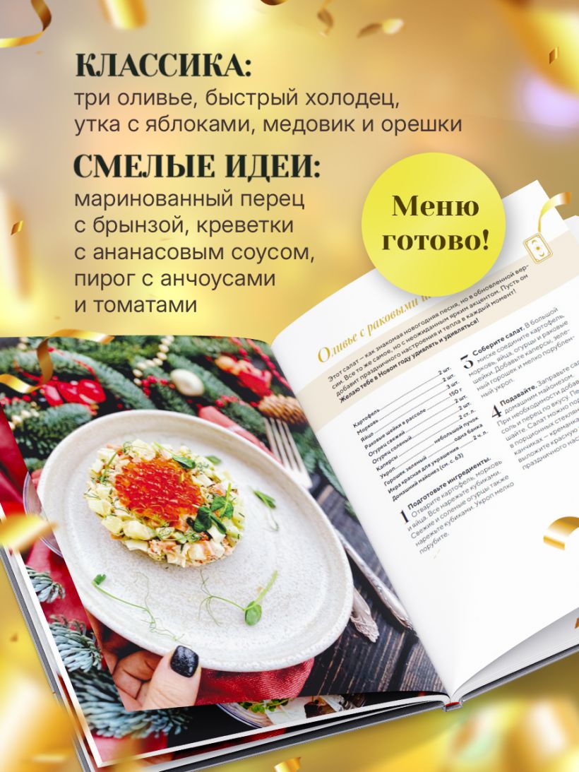 Новогоднее застолье — одна из самых приятных традиций. Кто-то собирает за столом всех родных и близких, кто-то встречает новогоднее чудо в узком кругу самых дорогих людей. Одни спешно пишут желание на салфетке и выпивают пепел вместе с шампанским, а другие громогласным «ура!» приветствуют наступление нового календаря. Какой бы стиль празднования вы ни выбрали, самым главным на торжестве, конечно же, будет праздничный стол, который накрывается с особой тщательностью, а подготовка к нему начинается задолго до праздника. Звучит миллион вопросов «что приготовить?», «что купить?», «где взять беспроигрышный рецепт, который понравится всем?» Новая книга Лизы Глузской — настоящий подарок для тех, кто любит готовиться к новогоднему застолью с чувством, с толком, с расстановкой ☺ В ней собраны фамильные рецепты семьи Глузских — это и Баранья нога, и Пирожки с мясом по бабулиному рецепту, и Похмельный харчо на 1 января, а также совсем новые, но уже испытанные рецепты Пряной утки, Вителло тоннато и Ушки с тапенадом, которые обязательно придутся вам по душе. Готовьте с удовольствием, празднуйте с восторгом, и пусть все ваши желания исполняются!