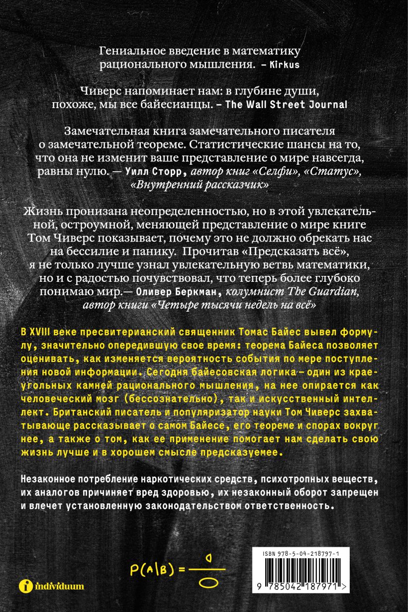 В XVIII веке пресвитерианский священник Томас Байес вывел формулу, значительно опередившую свое время: теорема Байеса позволяет оценивать, как изменяется вероятность события по мере поступления новой информации. Сегодня байесовская логика — один из краеугольных камней рационального мышления, на нее опирается как человеческий мозг (бессознательно), так и искусственный интеллект. Британский писатель и популяризатор науки Том Чиверс захватывающе рассказывает о самом Байесе, его теореме и спорах вокруг нее, а также о том, как ее применение помогает нам сделать свою жизнь лучше и в хорошем смысле предсказуемее.