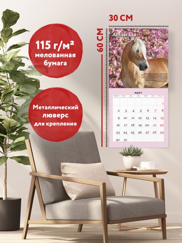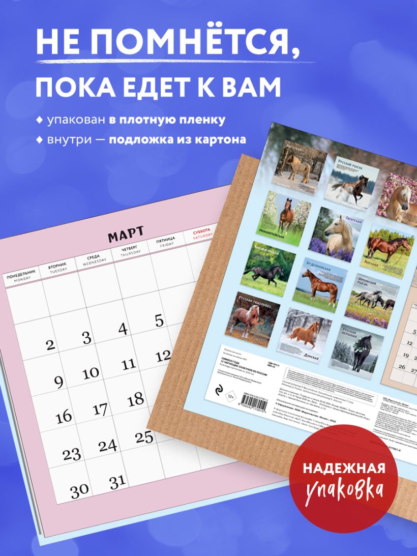 Перед вами не просто чарующие кони, а самые разные представители российских пород: донская, орловская, русская верховая и другие! Каждый месяц ваш глаз будет радовать очаровательный скакун на красивом природном фоне, а также вы сможете познакомиться с интересными фактами о каждой породе, которые будут сопровождать вас каждый месяц.
