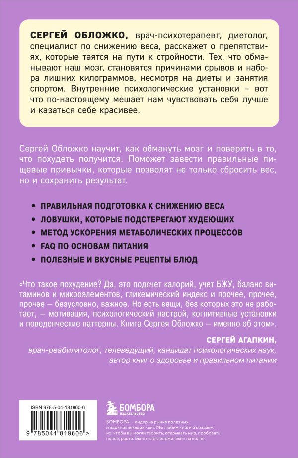 Комплект из двух книг-бестселлеров Сергея Обложко - врача-психотерапевта, диетолога, специалиста по снижению веса. Вместе с Сергеем Обложко вы смеетесь и вместе идете утром на весы с надеждой. Учитесь справляться с тягой и договариваться с собой. Эти книги заряжены энергией стройности!