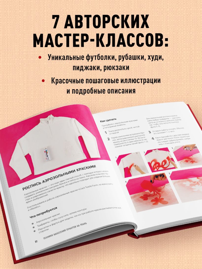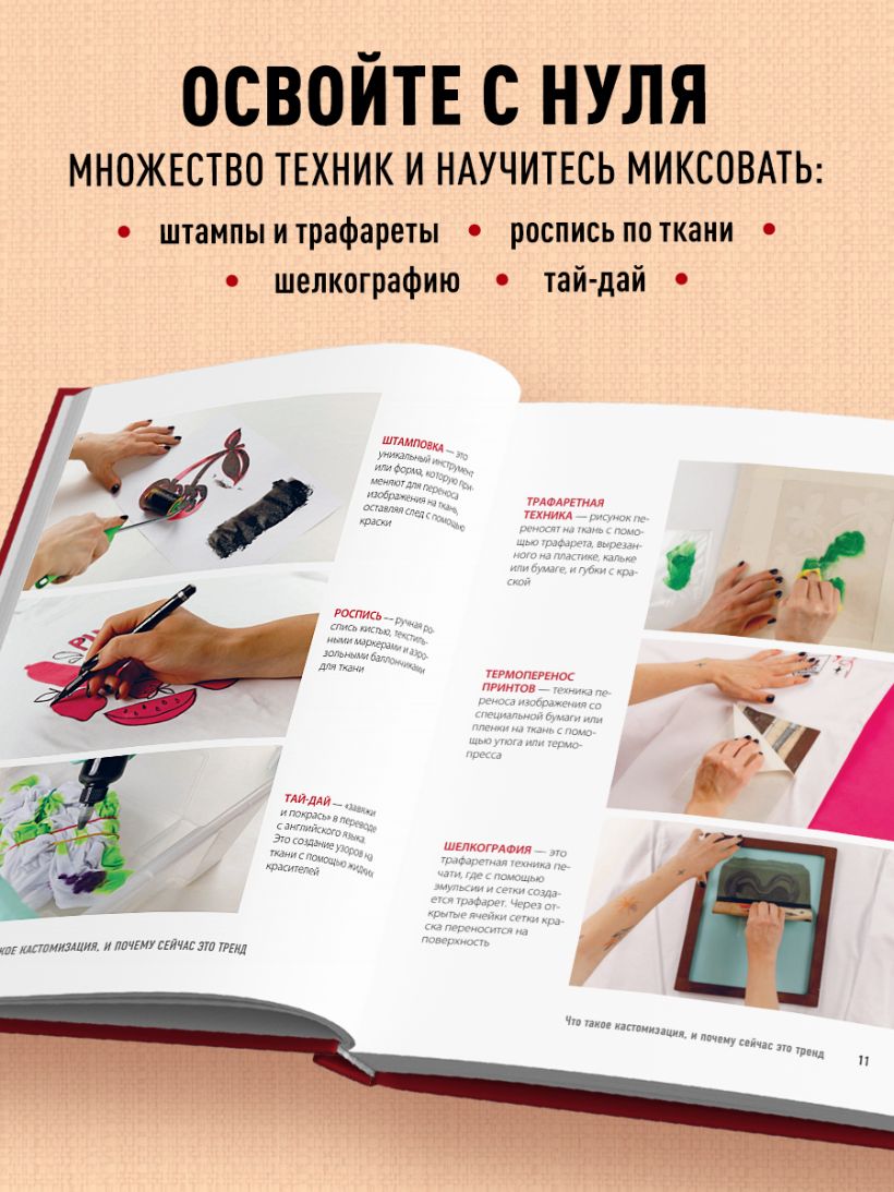 Вы познакомьтесь с множеством техник для нанесения принтов на ткань: от классических методов с трафаретами и штампами до более сложных, но удивительно эффектных — с использованием шелкографии, термопечати и ручной росписи. Каждая техника подробно описана и сопровождается яркими пошаговыми иллюстрациями. А самое главное — вам не понадобится специальное оборудование — творить можно прямо у себя дома!