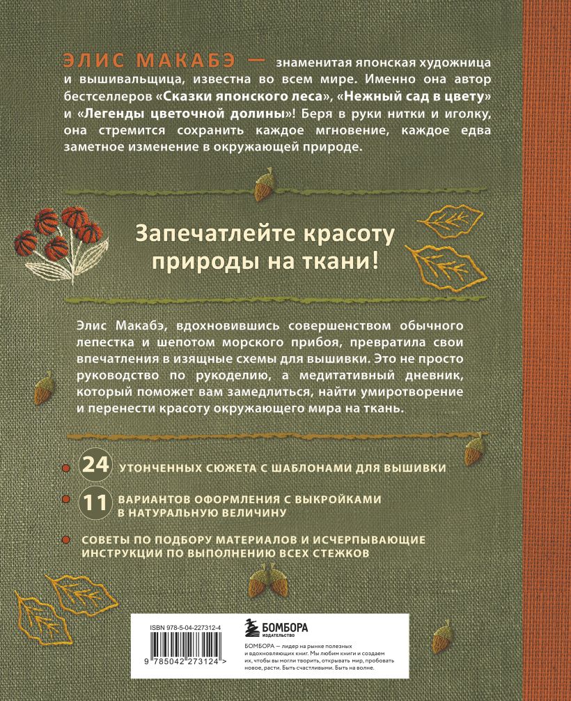 Элис Макабэ, вдохновившись совершенством каждого лепестка и шепотом морского прибоя, превратила свои впечатления в изящные схемы для вышивки. Это не просто руководство по рукоделию, а медитативный дневник, который поможет вам замедлиться, найти умиротворение и перенести красоту окружающего мира на ткань.