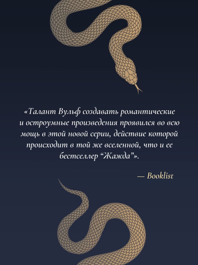 «Талант Вульф создавать романтические и остроумные произведения проявился во всю мощь в этой новой серии, действие которой происходит в той же вселенной, что и ее бестселлер “Жажда”». — Booklist