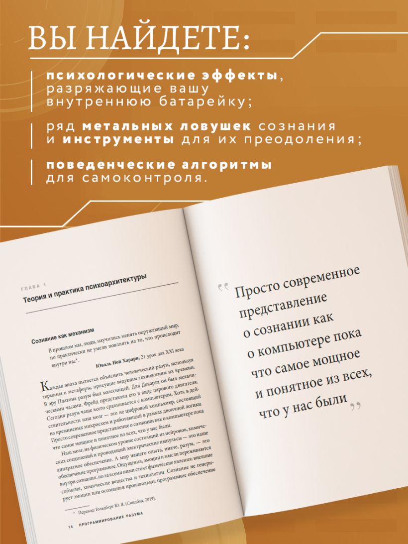 «Эта книга вводит понятие "психоархитектуры", обозначая им процесс осознанного и целенаправленного изменения собственной психики. С философских позиций стоицизма автор рассказывает о том, как применять проверенные техники когнитивной психологии для изменения своих мыслей, эмоций и поведения. Автор предлагает отказаться от почти любого страдания через осознание ценностей мудрости, самоконтроля и власти над самим собой. Я бы сказал, что книга очень хорошо написана — материал подаётся последовательно, со ссылками на источники и хорошим языком. Однозначно полезна для общего развития всем, и особенно подойдёт поклонникам методологии КПТ и сторонникам идей трансгуманизма». — КОНСТАНТИН КУНАХ, психолог-консультант
