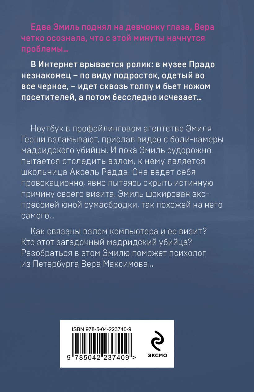 Роман филигранно играет на контрастах, леденящий брутальный кровавый триллер, соседствует здесь с изысканностью и утонченностью музеев. Искусство требует жертв и боли, не так ли? Удачно и то, что этот антураж здесь не остаётся просто антуражом, и необычной локацией и даже не исчерпывается на своей функции "контрастного душа", но является полноценным "участником" событий. Картины, тоже часть головоломки, отчасти зеркалящие героев и из сюжетные арки, где-то даже они опережают события, но ,чтобы это разгадать, нужно "разглядывать" те картины,что мелькают в сюжете. При том, что само расследование и не завязано на искусстве. Да и в целом повествование удачно встаёт в ряд испанских триллеров,от которых почему-то всегда ожидаешь легкомысленности и легкости (это же испания), а тебя бьют в лицо тьмой, и взрывают мозг ловушками.