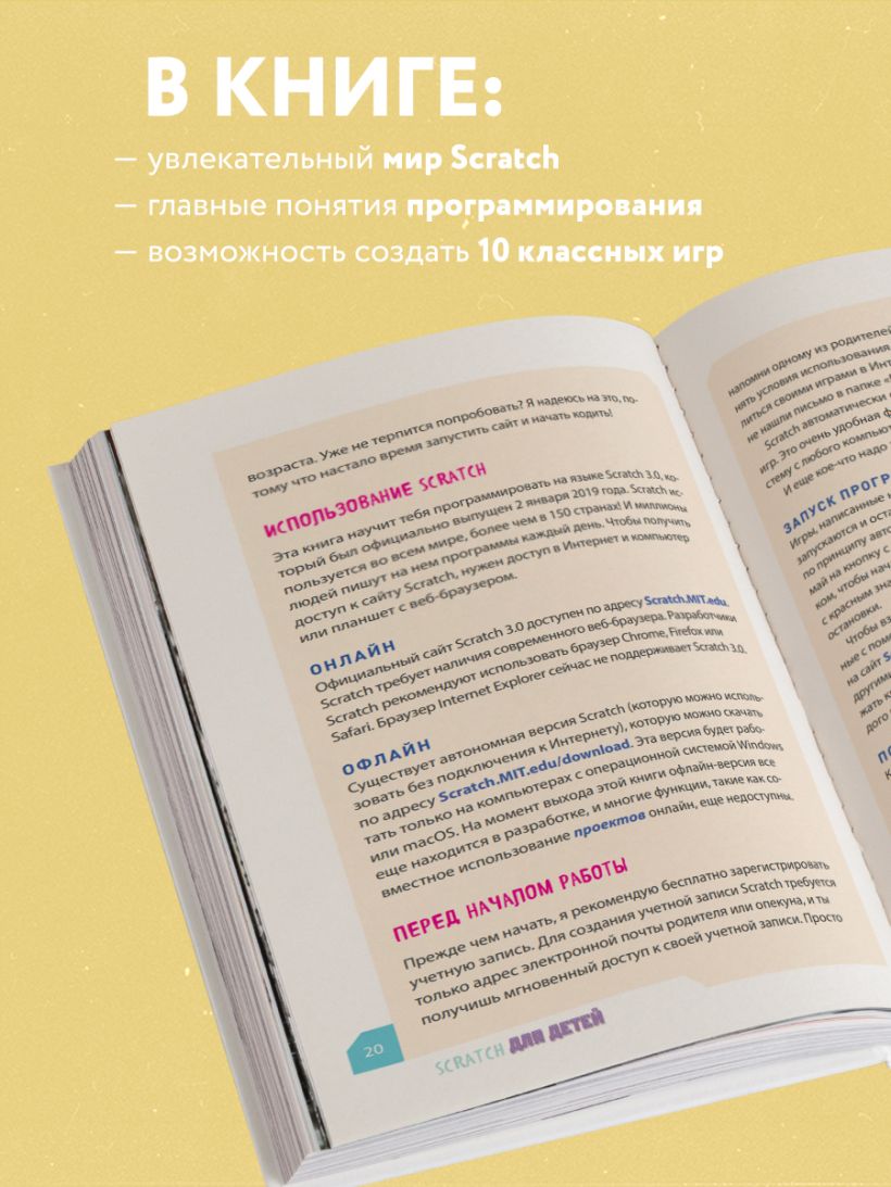 Язык Scratch - лучший первый язык для изучения программирования, ведь для его освоения не нужно ничего, кроме компьютера и интернета. Автор этой книги, профессиональный преподаватель программирования для детей из Калифорнии, приглашает вас и вашего ребенка в увлекательное путешествие по миру Scratch. Вы узнаете главные понятия в программировании, принципы создания программ, на практике примените полученные знания, а главное - сделаете целых десять смешных и очень интересных компьютерных игр, в которые сможете потом играть всей семьей!