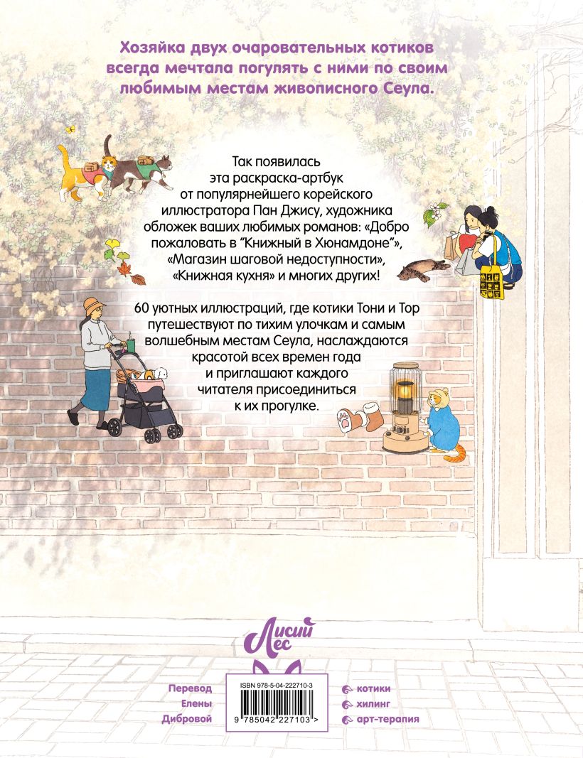 Так появилась эта раскраска от популярнейшего корейского иллюстратора Пан Джису, художника обложек ваших любимых романов: «Добро пожаловать в "Книжный в Хюнамдоне"», «Магазин шаговой недоступности», «Книжная кухня» и многих других! 60 уютных иллюстраций, где котики Тони и Тор путешествуют по тихим корейским улочкам и самым волшебным местам Сеула, наслаждаются красотой всех времен года и приглашают каждого читателя присоединиться к их прогулке.