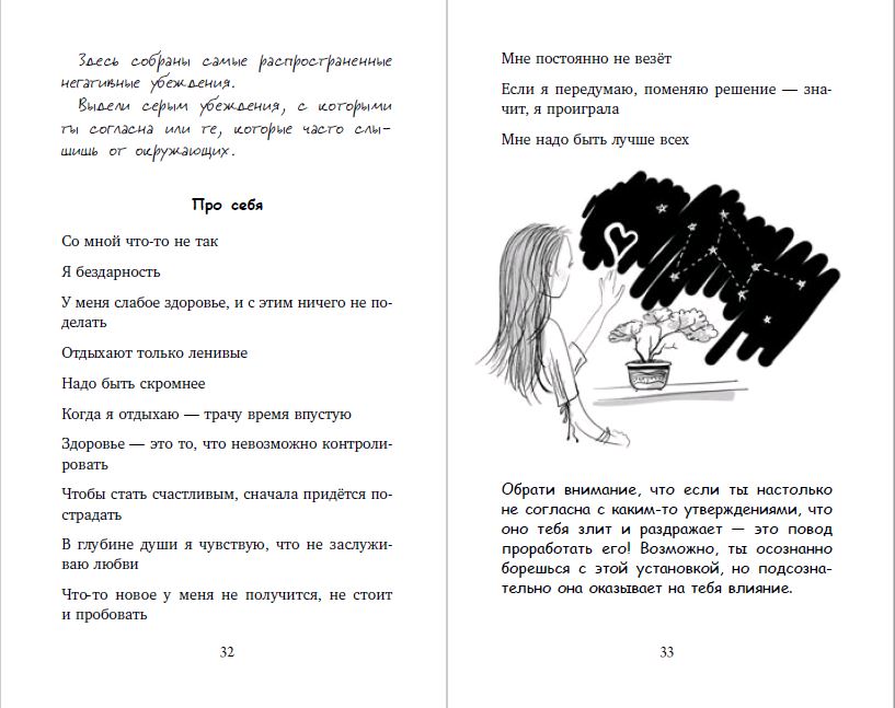 Книга представляет собой подробное объяснение техник вдохновения, написанное в виде коротких увлекательных рассказов с милыми чёрно-белыми иллюстрациями и страницами для записей и упражнений. Они помогут справиться с обидами и страхами, поднять себе настроение и найти время на творчество.