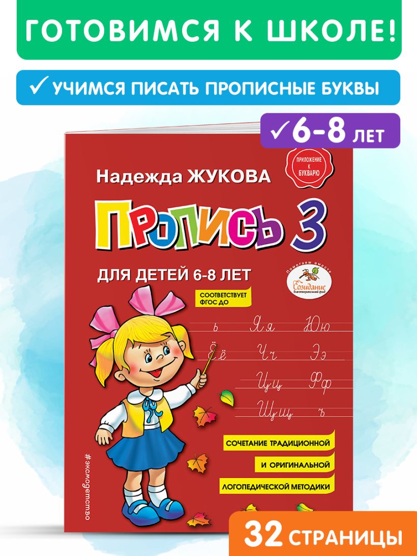 Прописи - приложение к знаменитому "Букварю" Надежды Жуковой, который успешно используют родители, воспитатели и педагоги. Задания усложняются от написания простых буквенных элементов до целых слов. Для удобства материал прописей разделен на 3 тетради, с которыми желательно работать последовательно. В третьей тетради изложены правила обучения написанию букв Ь, Я, Ю, Ё, Ч, Э, У, Ф, Щ. Прописи для дошкольников и детей, которые только начинают изучать буквы и письмо. Одно из самых эффективных пособий для обучения ребенка буквам. Оно поможет не только развить письмо и мелкую моторику, но и станет отличной подготовкой к школе. Автор – известный логопед-педагог со стажем более 30 лет, кандидат педагогических наук. Книги Жуковой — пример классического учебного пособия, в котором сочетаются традиционная и оригинальная логопедические методики.