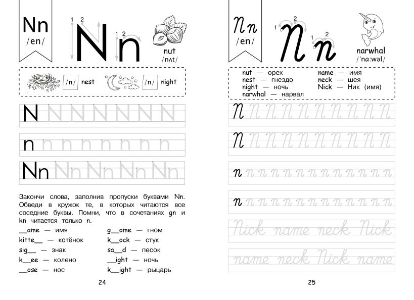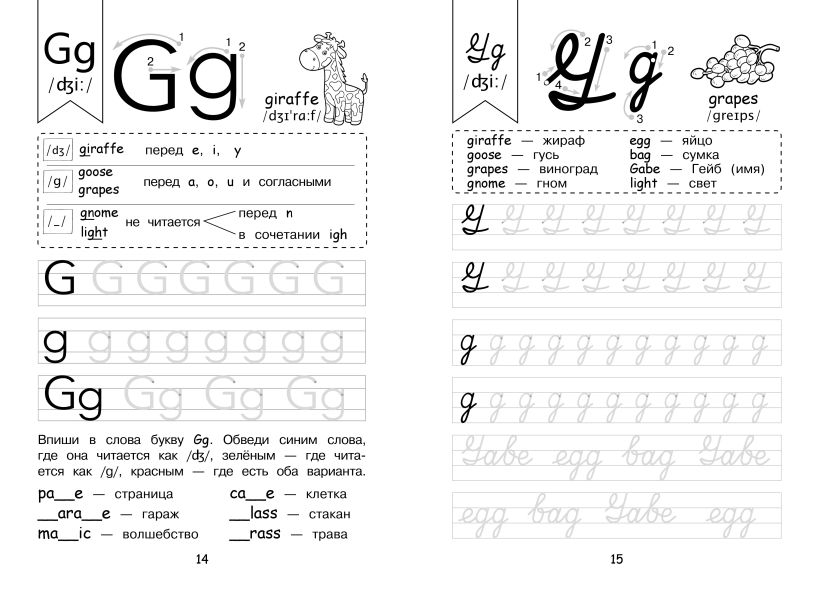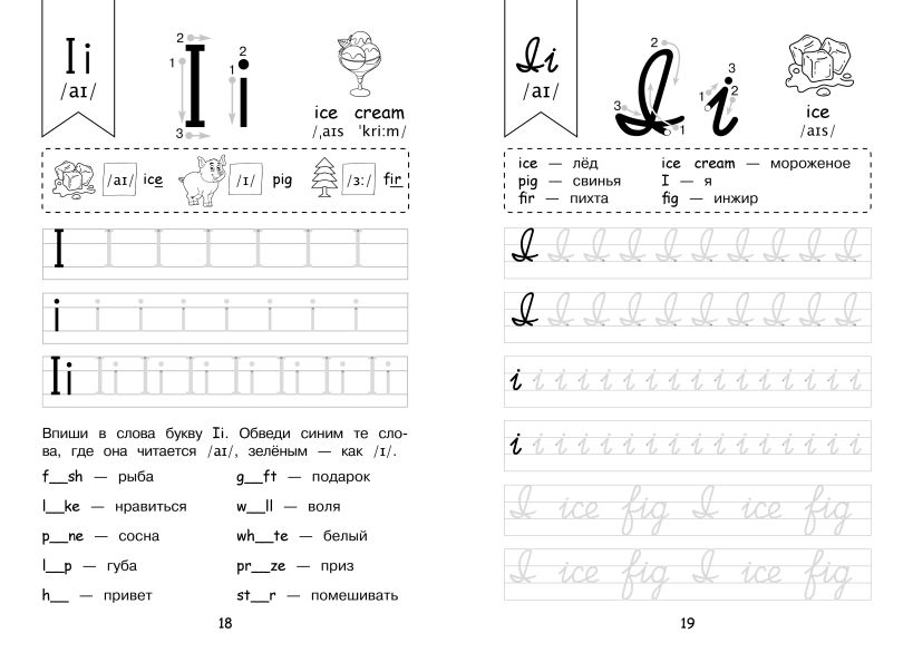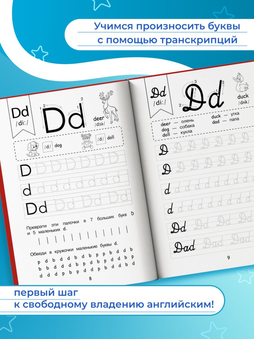 Пособие поможет детям не только освоить правильное написание печатных и письменных английских букв, но и запомнить их и уверенно различать при любом написании. Выполняя разнообразные упражнения, они не только будут красиво писать, но и запомнят 180 английских слов и получат первые уроки правильного произношения. Дети знакомятся с буквами в алфавитном порядке, а в заданиях на прописывание слов используются только те буквы, которые они уже запомнили и написали!