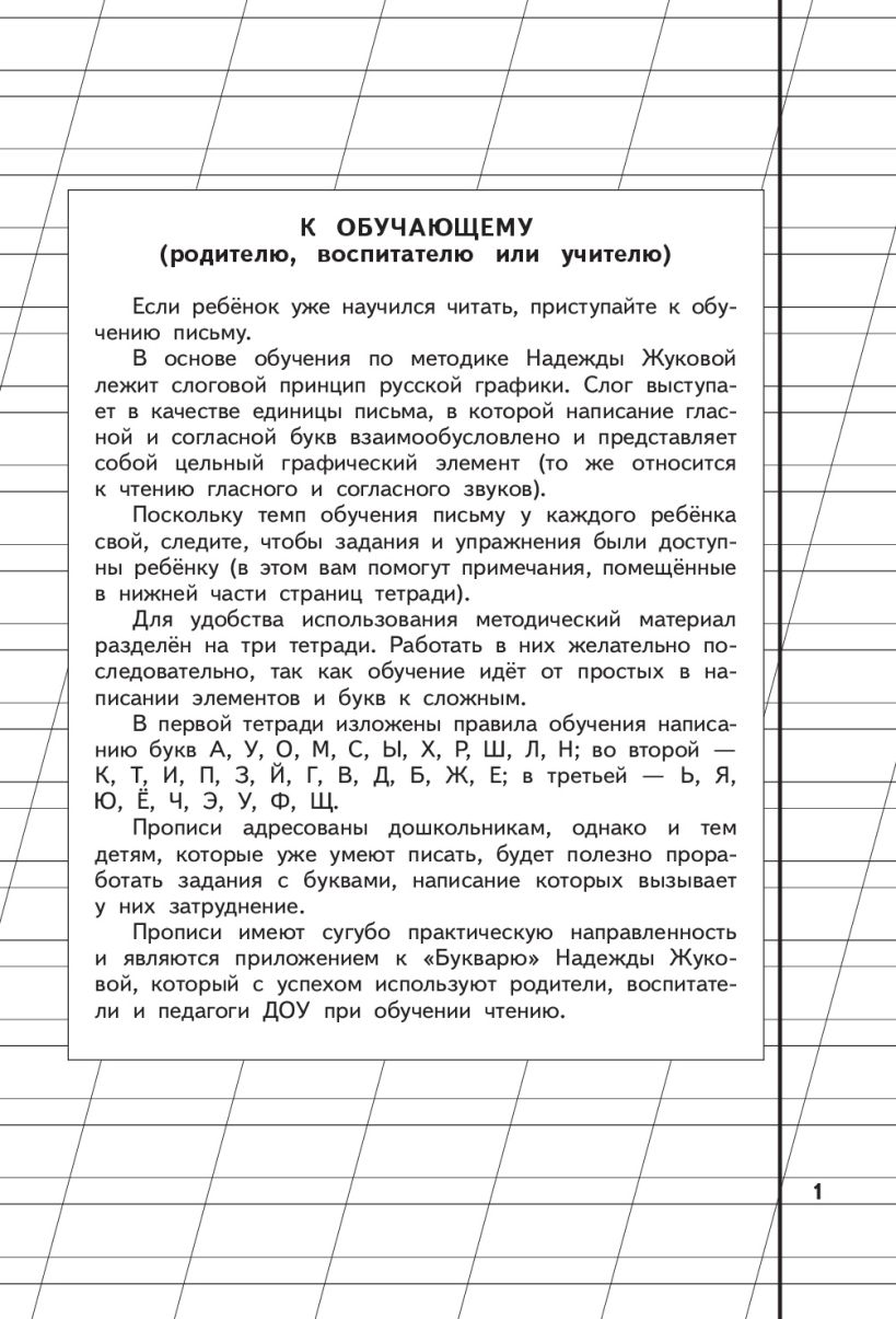 Комплект из 3 тетрадей для обучения детей письму. В основе обучения по методике Надежды Жуковой лежит слоговой принцип русской графики. Для удобства обучения материал прописей разделен на 3 тетради, с которыми желательно работать последовательно. В первой тетради изложены правила обучения написанию букв А, У, О, М, С, Ы, X, Р, Ш, Л, Н; во второй —К, Т, И, П, З, Й, Г, В, Д, Б, Ж, Е; в третьей — Ь, Я, Ю, Ё, Ч, Э, У, Ф, Щ.