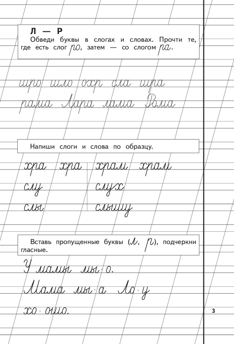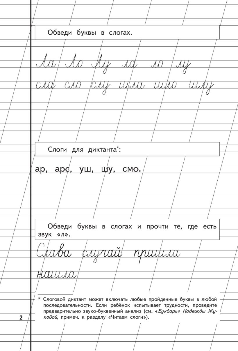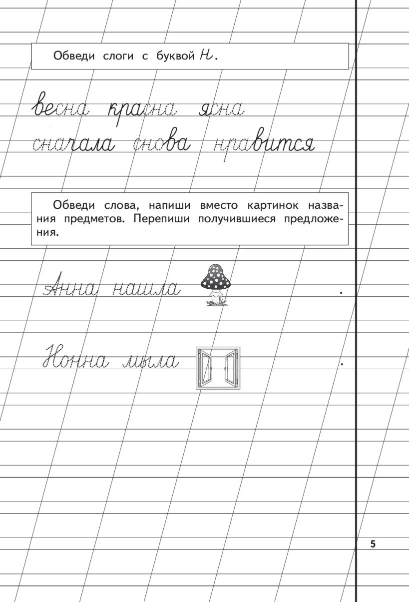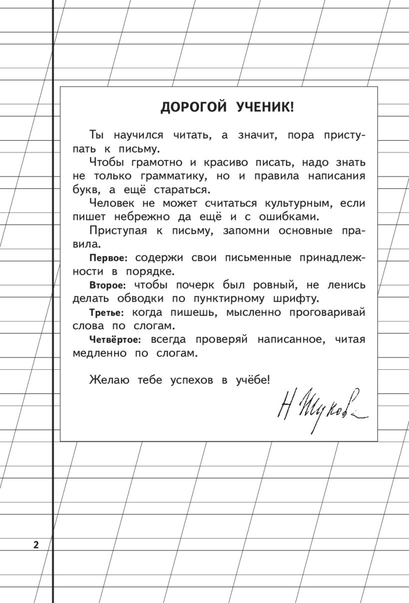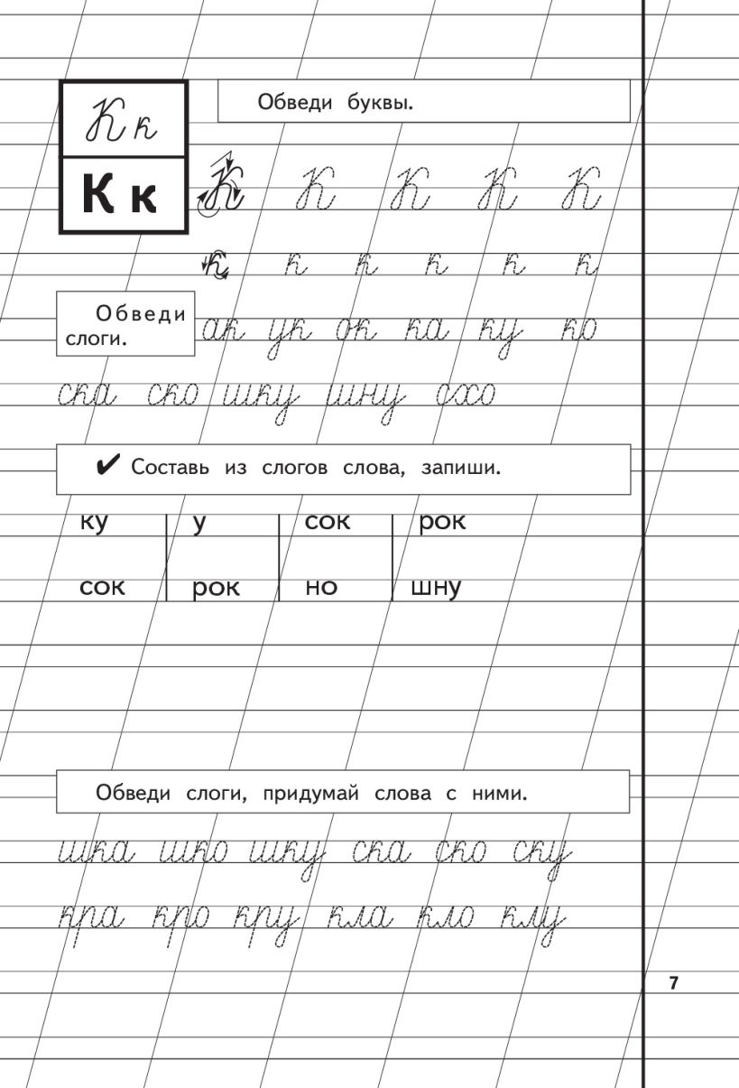 Пособие, соответствующее ФГОС, — отличный помощник первоклассника по формированию аккуратного почерка, усвоению приёмов правильного письма, развитию мелкой моторики, внимания, глазомера. Работая в книге, учащиеся будут выполнять задания на отработку навыков написания букв и их элементов, слогов, слов и простых предложений, повторят алфавит, правописание безударной гласной в корне, глухих и звонких согласных, заглавной буквы, словарных слов, сочетаний ЖИ-ШИ, ЧА-ЩА, ЧУ-ЩУ, ЧК, ЧН, ЧТ. Пособие поможет ученикам дополнительно позаниматься и закрепить полученные в школе умения. Первокласснику тяжело долго заниматься непрерывным письмом. Переключить внимание ребёнка помогут игровые задания — упражнения на обводку предметов по пунктиру, штриховку в разных направлениях, копирование и дорисовывание узоров. Занимаясь по пособию, учащиеся смогут: • Отработать написание букв, слогов, слов и предложений. • Развить орфографическую зоркость. • Выработать уверенный, разборчивый красивый почерк.