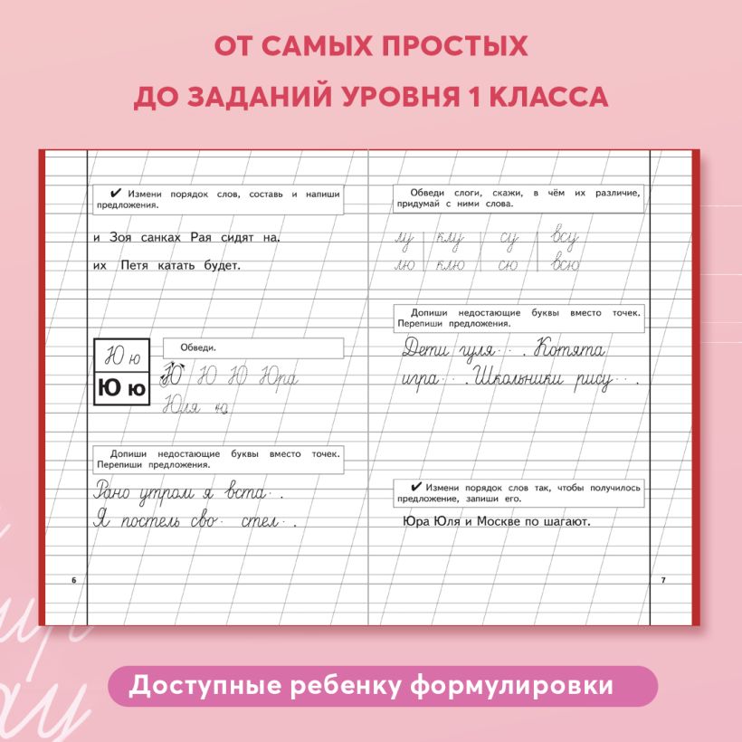 Пособие, соответствующее ФГОС, — отличный помощник первоклассника по формированию аккуратного почерка, усвоению приёмов правильного письма, развитию мелкой моторики, внимания, глазомера. Работая в книге, учащиеся будут выполнять задания на отработку навыков написания букв и их элементов, слогов, слов и простых предложений, повторят алфавит, правописание безударной гласной в корне, глухих и звонких согласных, заглавной буквы, словарных слов, сочетаний ЖИ-ШИ, ЧА-ЩА, ЧУ-ЩУ, ЧК, ЧН, ЧТ. Пособие поможет ученикам дополнительно позаниматься и закрепить полученные в школе умения. Первокласснику тяжело долго заниматься непрерывным письмом. Переключить внимание ребёнка помогут игровые задания — упражнения на обводку предметов по пунктиру, штриховку в разных направлениях, копирование и дорисовывание узоров. Занимаясь по пособию, учащиеся смогут: • Отработать написание букв, слогов, слов и предложений. • Развить орфографическую зоркость. • Выработать уверенный, разборчивый красивый почерк.