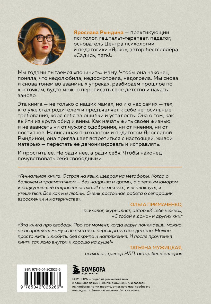 Эта книга — не только о наших мамах, но и о нас самих — тех, кто уже стал родителем и предъявляет к себе непосильные требования, коря себя за ошибки и усталость, за то, что тоже когда-то было трудно. Она о том, как выйти из круга обид и вины. Как начать жить своей жизнью и не зависеть ни от маминого одобрения, ни от её мнения, ни от её поступков. Написанная психологом и педагогом Ярославой Рындиной, она приглашает встретиться с настоящей, живой матерью — перестать её демонизировать и исправлять.