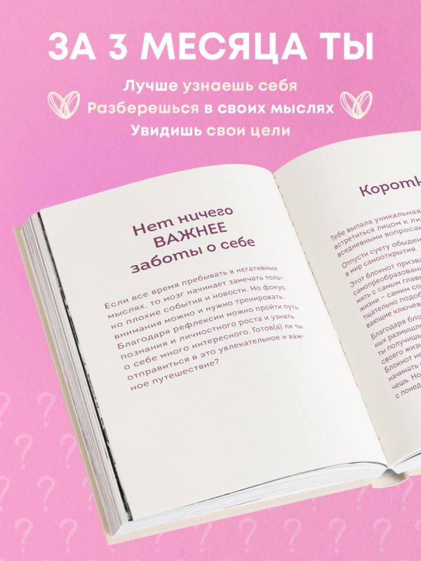 Начни свой путь к самопознанию уже сегодня. Пусть наш уникальный блокнот станет твоим источником вдохновения и верным спутником в познании собственного внутреннего мира. Он предлагает редкую возможность глубже узнать себя с помощью тщательно подобранных вопросов, затрагивающих важные аспекты твоей жизни. Ежедневно в течение трех месяцев ты будешь получать новый вопрос, который поможет тебе разобраться в своих чувствах. Благодаря регулярным размышлениям и еженедельным обзорам ты обретешь ясное видение себя, своих жизненных целей и устремлений. Ты заслуживаешь знать себя лучше. Позволь себе отвлечься от суеты повседневности и окунуться в свой внутренний мир.