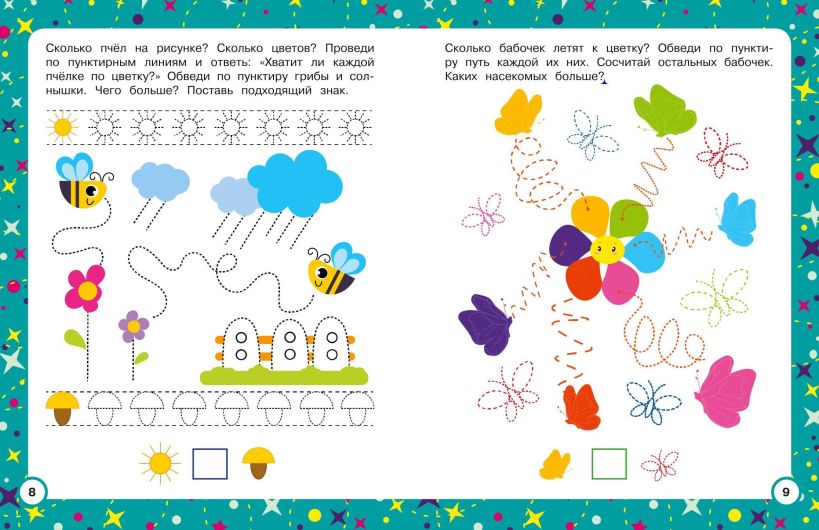 Занимаясь, ребёнок будет обводить по пунктиру, считать, писать цифры, сравнивать предметы по количеству и соотносить количество с числом, решать простые задачи на сложение и вычитание.