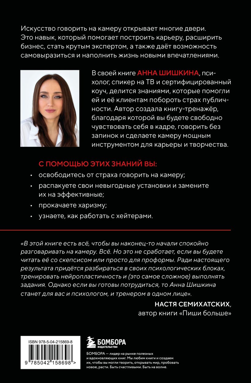 «В этой книге есть всё, чтобы вы наконец-то начали спокойно разговаривать на камеру. Всё. Но это не сработает, если вы будете читать её со скепсисом или просто для проформы. Ради настоящего результата придётся разбираться в своих психологических блоках, тренировать нейропластичность и (это самое сложное) выполнять задания. Однако если вы готовы потрудиться, то Анна Шишкина станет для вас и психологом, и тренером в одном лице. И ваши социальные сети начнут заполняться долгожданными видео с вами в главной роли. Удачи на этом непростом и волнительном пути!» — Настя Семихатских, автор книги «Пиши больше»