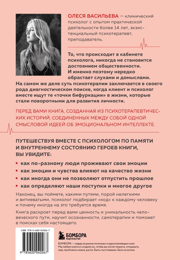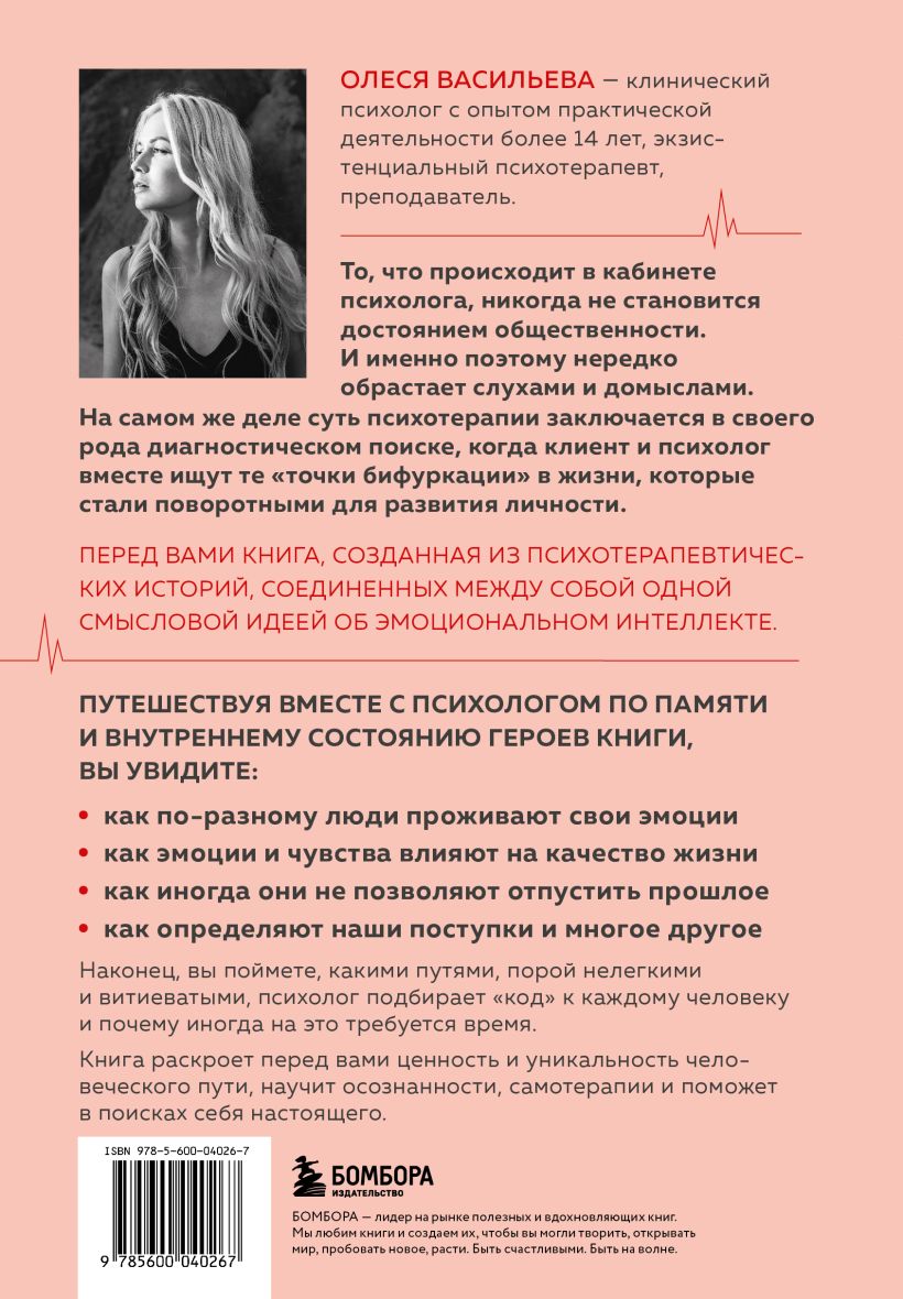 ЭМОЦИОНАЛЬНЫЙ КОД: Эта книга – способ понять, как работает психолог, с какими запросами приходят к нему в кабинет, чем он может помочь. Читая различные психотерапевтические истории, вы откроете для себя суть понятия "эмоциональный интеллект", научитесь понимать собственные эмоции, чувства и реакции, а еще – управлять ими. А значит – станете более устойчивыми к различным трудностям и сможете прожить хорошую, счастливую жизнь.