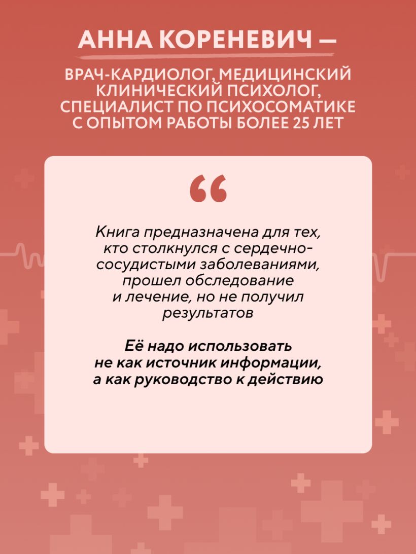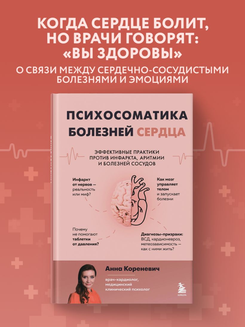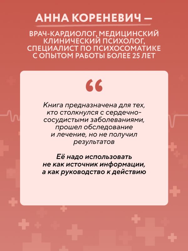 Книга от опытного врача-кардиолога и медицинского клинического психолога Анны Кореневич поможет вам узнать, почему хронический стресс — это скрытый и при этом опаснейший враг сердечно-сосудистой системы и почему справиться с ним можно лишь работая с собственным подсознанием.