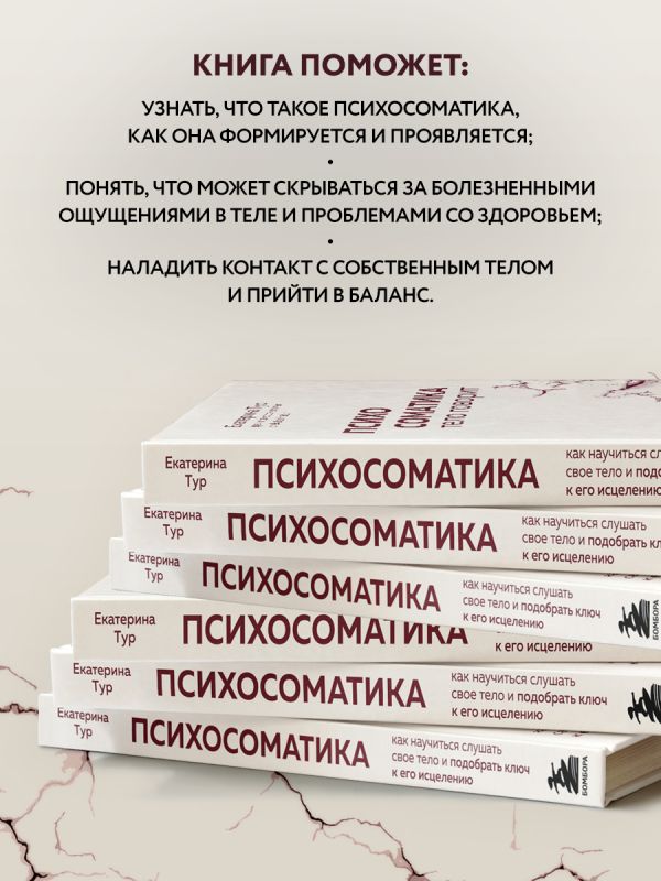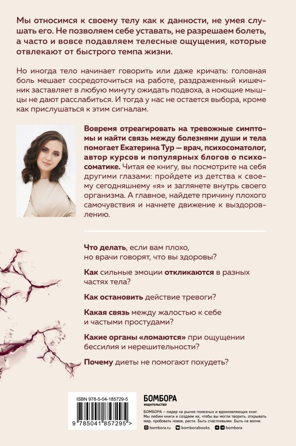 Врач и психосоматолог Екатерина Тур помогает прислушаться к своему организму, распознать внутренний конфликт и проработать его. На основе своей 12-летней практики и современных исследований она рассказывает о связи душевной боли и физических симптомов и дает рекомендации, как почувствовать себя лучше.