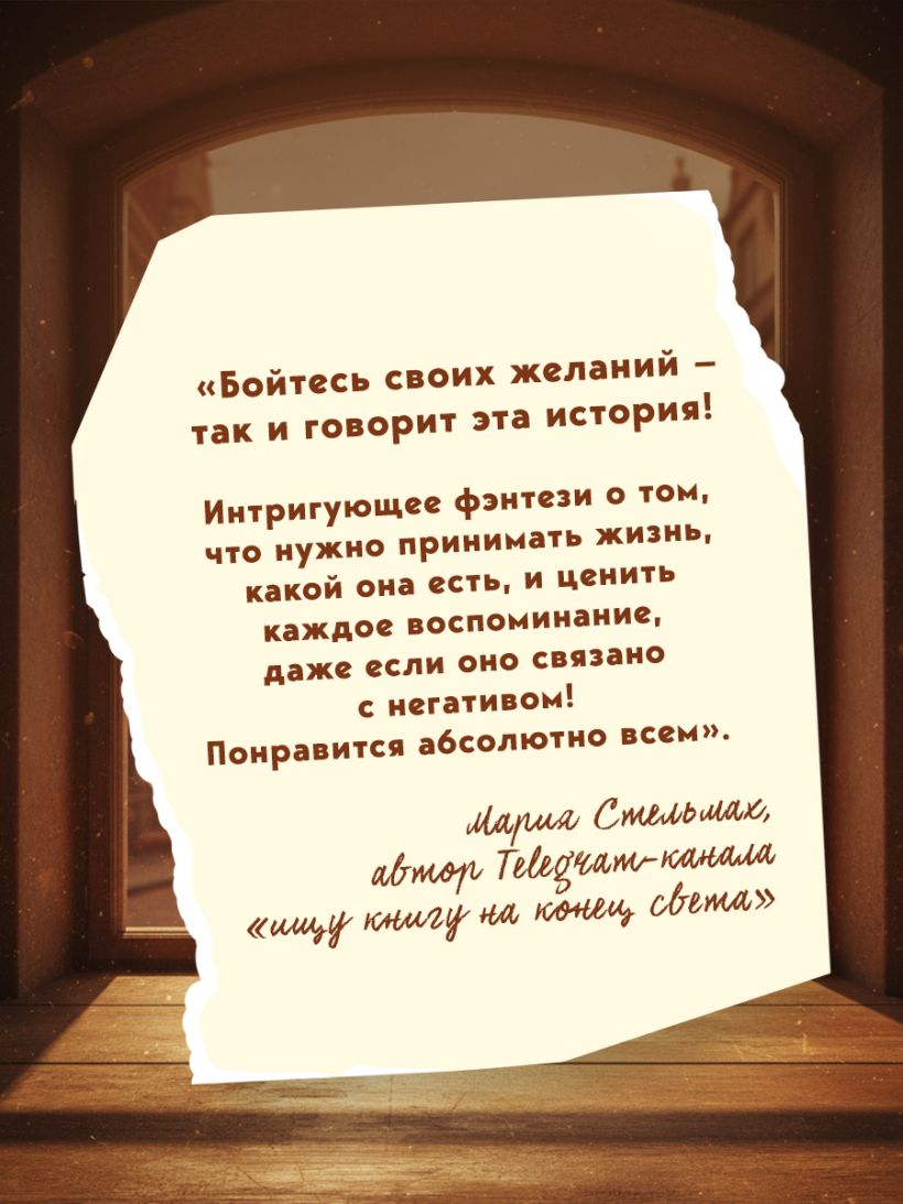 «Бойтесь своих желаний — так и говорит эта история! Интригующее фэнтези о том, что нужно принимать жизнь, какой она есть, и ценить каждое воспоминание, даже если оно связано с негативом! Понравится абсолютно всем». — Мария Стельмах, автор Telegram-канала «ищу книгу на конец света»