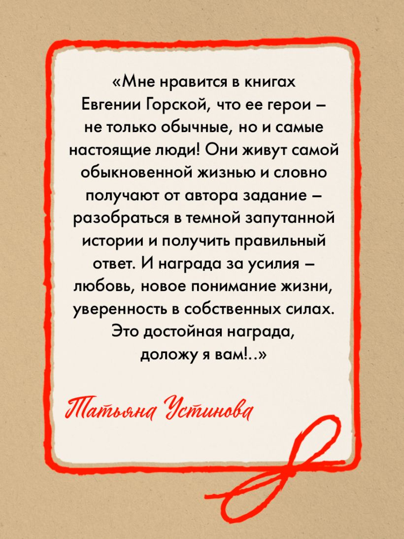 Татьяна Устинова рекомендует: «Мне нравится в книгах Евгении Горской, что ее герои — не только обычные, но и самые настоящие люди! Они живут самой обыкновенной жизнью и словно получают от автора задание — разобраться в темной запутанной истории и получить правильный ответ. И награда за усилия — любовь, новое понимание жизни, уверенность в собственных силах. Это достойная награда, доложу я вам!..»