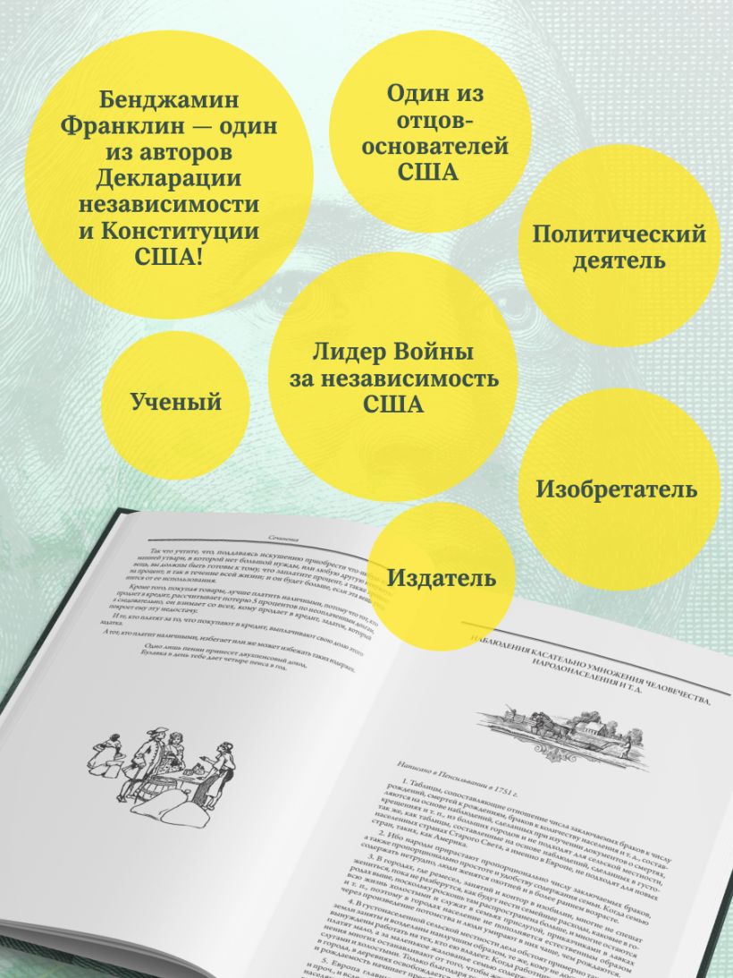 Бенджамин Франклин (1706—1790) — политический деятель, дипломат, ученый, изобретатель, журналист, издатель. Один из лидеров Войны за независимость США. Единственный из отцов-основателей, скрепивший своей подписью все три важнейших исторических документа, что лежат в основе образования Соединенных Штатов Америки как независимого государства: Декларацию независимости США, Конституцию США и Версальский мирный договор 1783 года.