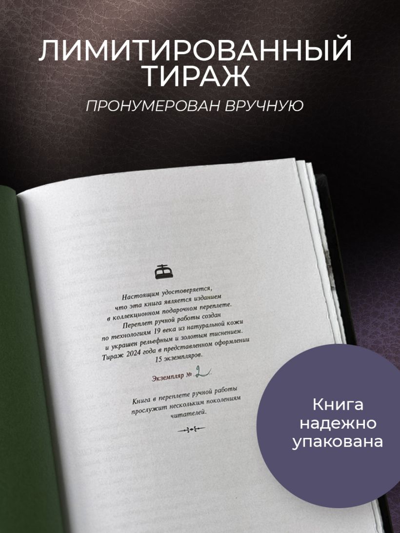 Коллекционное издание в серии «Великие личности», включающей в себя 21 том знаменитых сочинений крупнейших философов, ученых, писателей и военачальников прошлых веков и нового времени в популярном изложении. Издание в переплёте ручной работы отпечатано на бумаге премиум-класса цвета чайной розы и сшито вручную. Заявленный тираж 2020 года - 15 нумерованных экземпляров. В каждом экземпляре - избранные цитаты и гравированный портрет автора, отпечатанные на дизайнерской бумаге, изготовленной на четверть из натуральной кожи. Переплеты созданы по традиционной для 19 века технологии из гладкой натуральной кожи и украшены тремя видами рельефного тиснения - золотым. рельефным и красочным. Форзацы книги из дизайнерской тонированной бумаги и тиснёные золотом орнаментальные дублюры. Каптал и ляссе из шелка и трехсторонний торшонированный обрез.