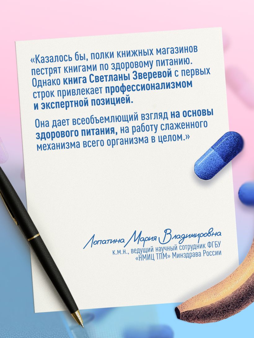 Какие законы питания должны соблюдаться, какие макро- и микронутриенты нужны организму, в чем их взаимосвязи и как они влияют на организм, что такое БАДы и кому они нужны – все это вы найдете в книге Светланы Зверевой». - Владимир Абдулаевич Дадали, биохимик, доктор химических наук, профессор кафедры биологической и общей химии им. В. В. Соколовского СЗГМУ им. И. И. Мечникова. Доктор философии по натуральной медицине и сертифицированный консультант по нутрициологии Университета натуральной медицины (г. Портленд, штат Орегон, США). Академик Балтийской педагогической академии.