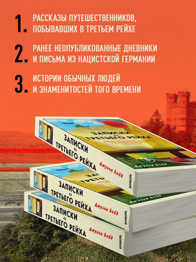 В книге «Записки из Третьего рейха. Жизнь накануне войны глазами обычных туристов» собраны истории студентов, политиков, музыкантов, дипломатов, школьников, коммунистов, ученых, спортсменов, поэтов, журналистов, художников, туристов, простых людей и знаменитостей вроде Чарльза Линдберга и Сэмюэла Беккета. Случайные очевидцы истории и их тревожные, абсурдные, трогательные, трагические рассказы предоставляют нам возможность посмотреть на Германию времен Третьего Рейха с совершенно другой точки обзора.