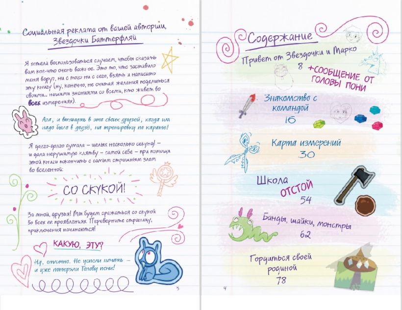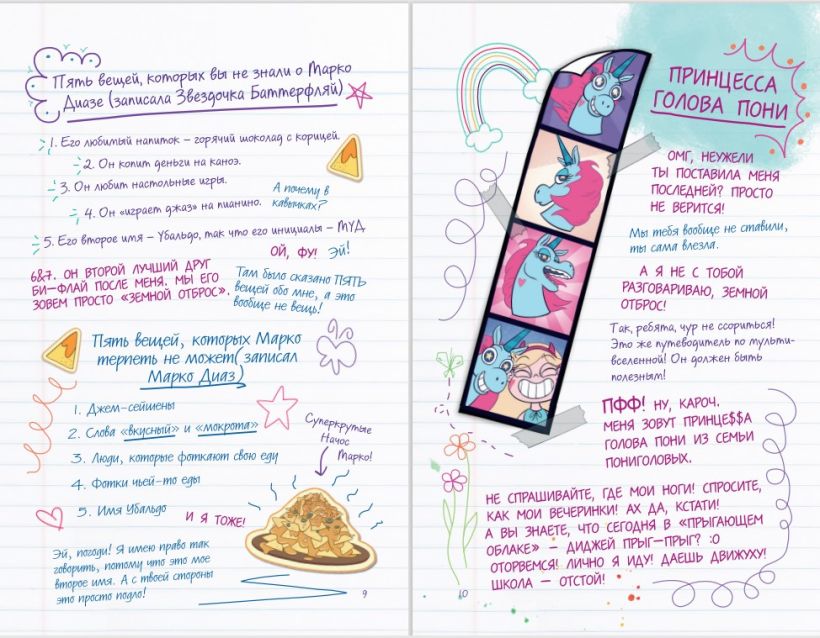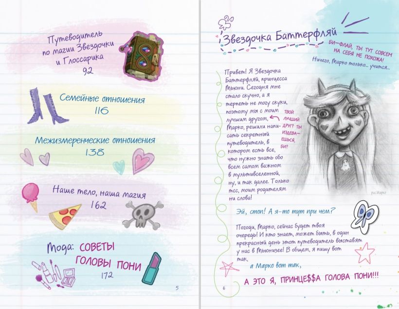 "Путеводитель Звездочки и Марко по всем измерениям" - это путеводитель по вселенной популярного анимационного сериала "Звездная принцесса и силы зла", который идет на телеканале Disney. Эта книга понравится не только поклонникам мультфильма, но и фанатам "Гравити Фолз". Столько же юмора, приколов, необычайных происшествий и мегакрутых персонажей! Звездочка Баттерфляй - принцесса с далекой планеты Мьюни, которую родители отправляют на Землю. Звездочка останавливается в доме у семейства Диазов, где и знакомится с Марко. Все бы ничего, и они даже становятся лучшими друзьями, вот только Звездочка привыкла жить по законам и традициям своего мира. А это значит, что ей ничего не стоит при помощи волшебной палочки устроить из дома Диазов аквапарк, наколдовать щеночков, стреляющих лазерными лучами и превратить школьную учительницу в тролля. Короче говоря, Марко ждут еще те приключения!