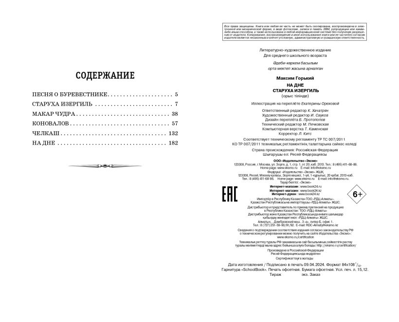 В сборник вошли самые известные ранние произведения Максима Горького — драма «На дне», до сих пор не сходящая с лучших театральных сцен мира, стихотворение в прозе «Песня о Буревестнике», рассказы «Челкаш», «Коновалов», «Старуха Изрегиль», а также шедевр романтической прозы Горького «Макар Чудра».