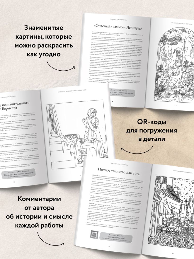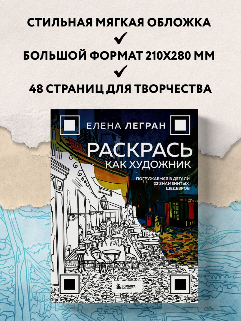 Новая раскраска «Раскрась как художник. Погружаемся в детали 22 знаменитых шедевров» предлагает уникальный опыт: возможность самому создать известные картины великих мастеров — шаг за шагом, мазок за мазком. На ее страницах собрано 22 гениальных произведения, изменивших ход мировой живописи — от Леонардо до Магритта, — и каждый шедевр здесь не просто для просмотра, а для со-творчества. Это настоящая арт-терапия и глубокое погружение в мир художественного творчества, где тексты от Елены Легран — известного искусствоведа, историка и автора книг-бестселлеров по искусству — раскроют вам секреты истории каждой картины, мотивы и вдохновение ее создателей.