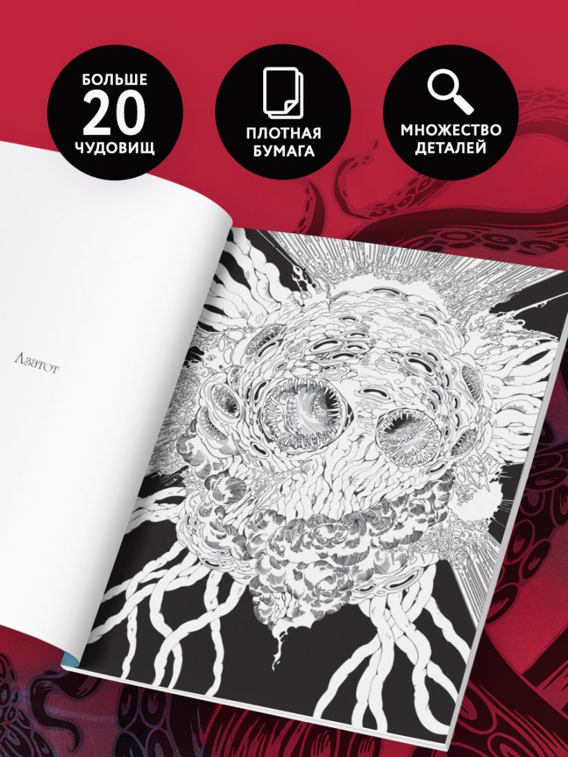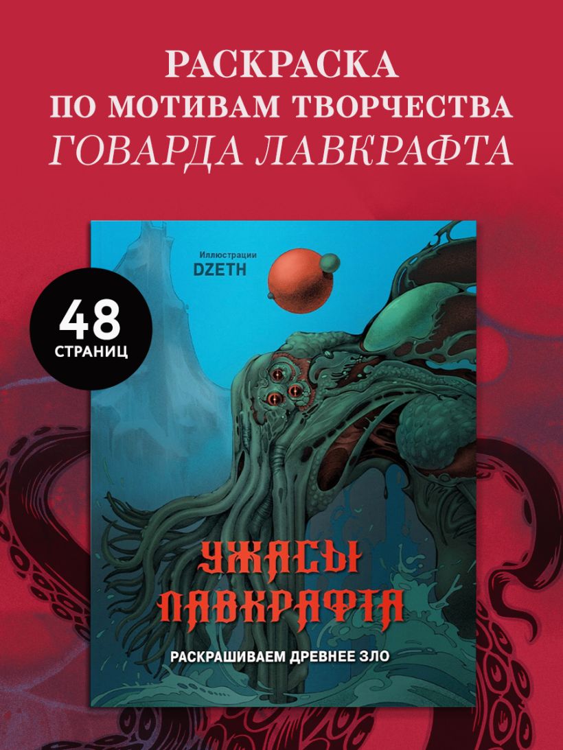 Темные воды, устрашающие божества, атмосфера ужаса и безумия… Внутри этой раскраски вы найдете больше двадцати неописуемых чудовищ по мотивам творчества великого и ужасного Говарда Филлипса Лавкрафта, нарисованных популярным художником DZETH.