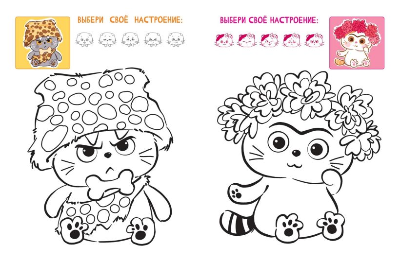 Рядом с каждым рисунком есть дополнительные элементы для раскрашивания — трекер настроения, где ты можешь раскрасить свою эмоцию!
