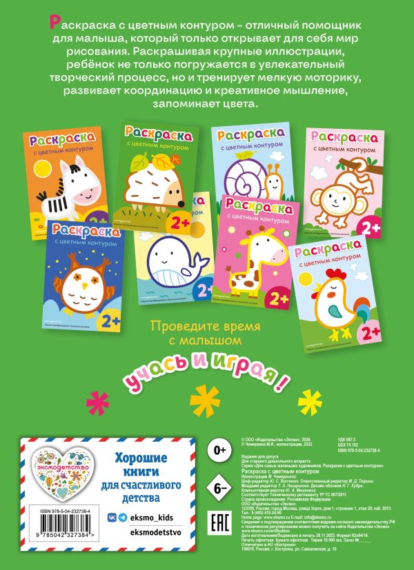Внутри каждой раскраски — крупные и яркие иллюстрации, которые будут интересны как мальчикам, так и девочкам. Благодаря четким линиям, толстому цветному контуру и образцу для раскрашивания эти рисовалки способствуют развитию мелкой моторики и помогут ребенку научиться различать цвета и подбирать правильные оттенки. Милые иллюстрации со зверятами так же станут отличным поводом познакомить малыша с животным миром.