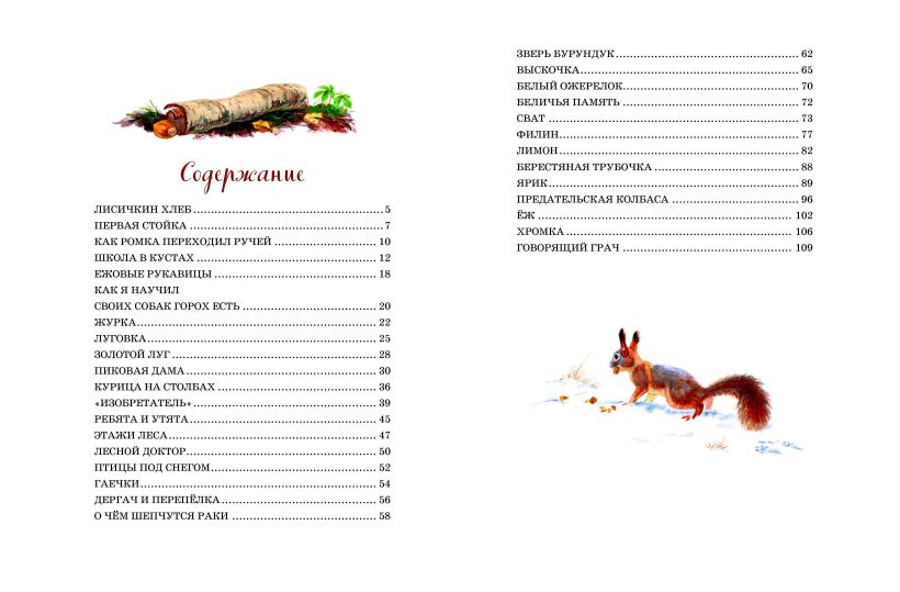 В сборник вошли 32 рассказа о разнообразных обитателях леса и домашних животных: «Журка», «Ребята и утята», «Лисичкин хлеб», «Берестяная трубочка», «Лимон», «Предательская колбаса» и многие-многие другие.